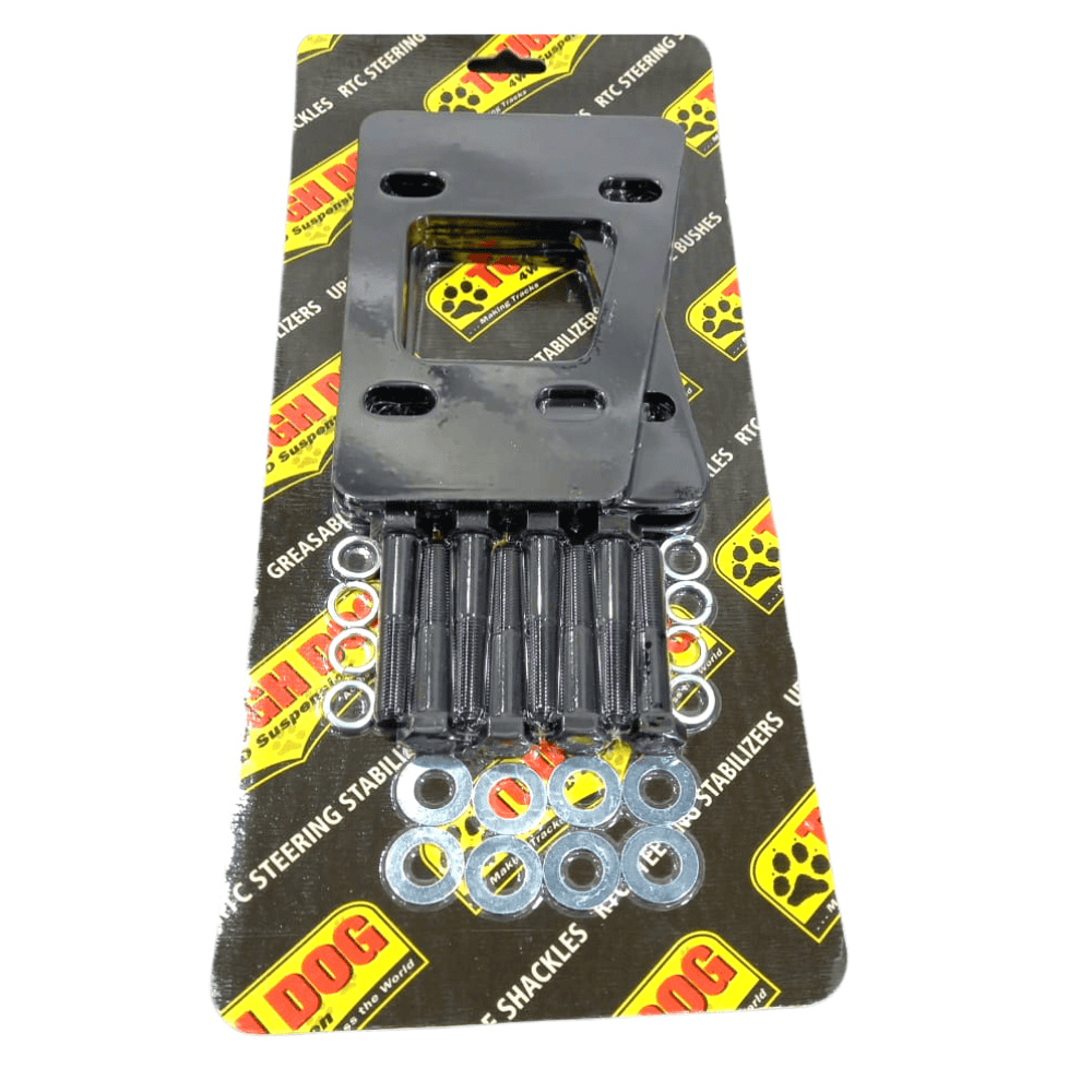Designed to reduce tail shaft angle and remove driveline vibration that arises from an out-of-phase drivetrain. The universal joints in a vehicleโs tail shaft must operate at the same angle to operate harmoniously. If the angle of one universal joint is different to the other, or the universal joints are forced to operate on an angle larger that within tolerance, the resulting vibration can be felt through the vehicle when driven. To restore the universal joints to harmony, Tough Dog spacer kits are available for vehicles that commonly suffer from vibration.